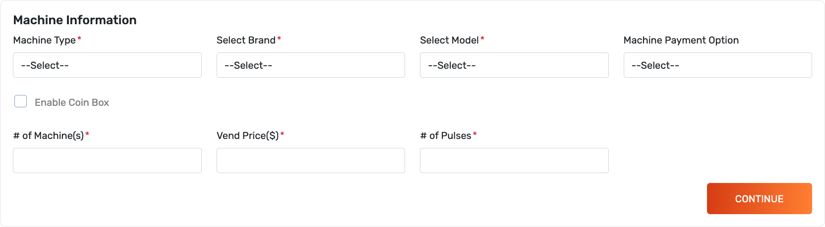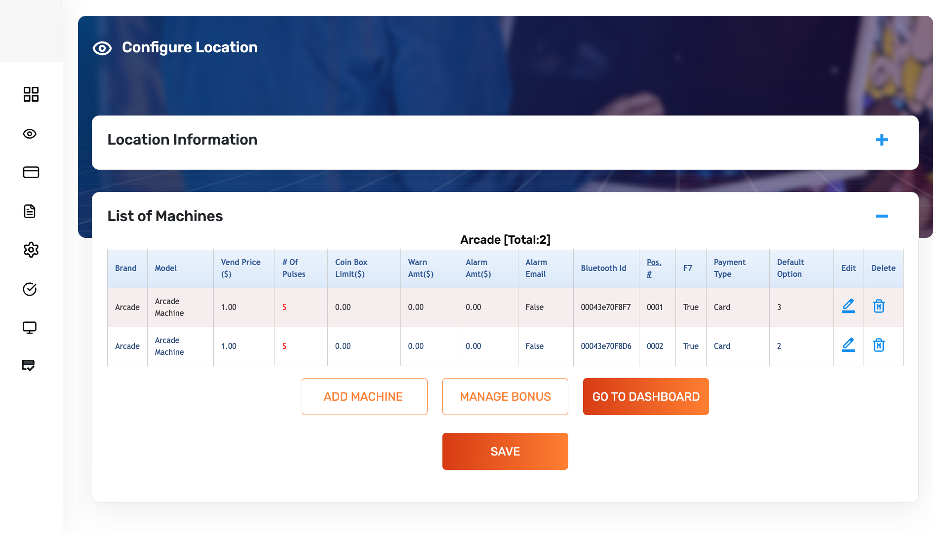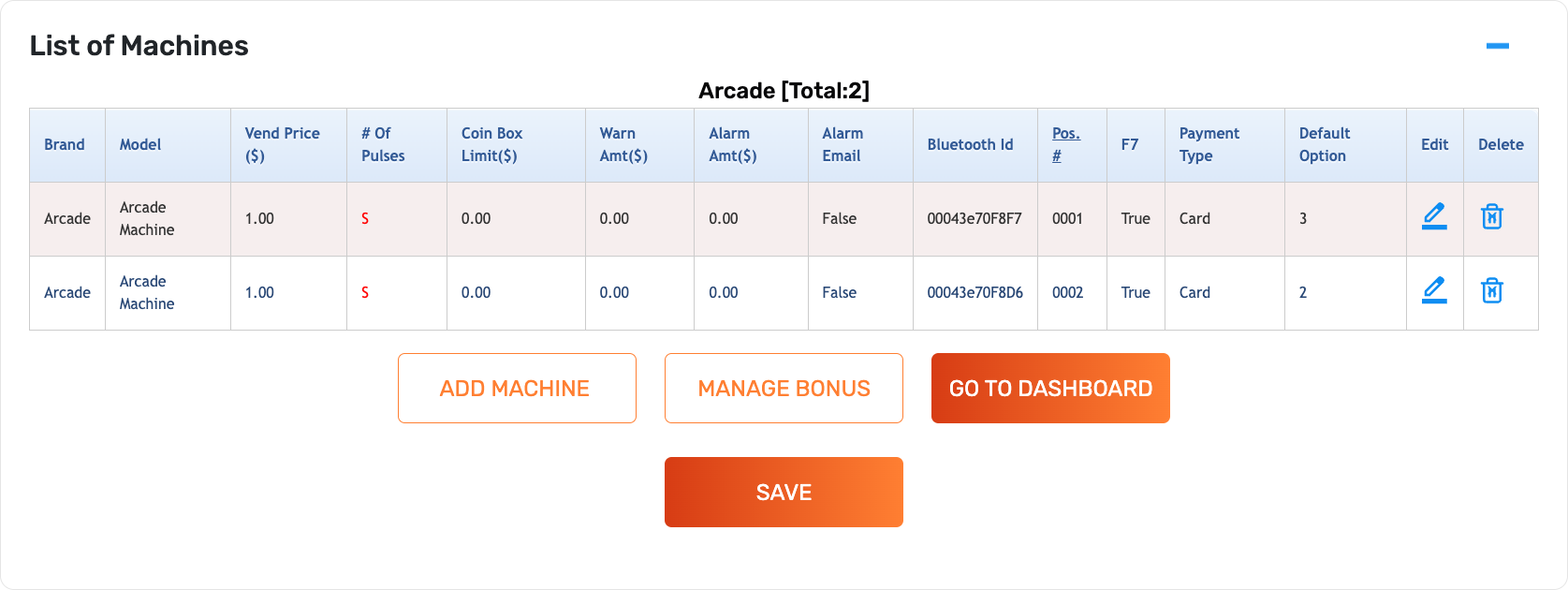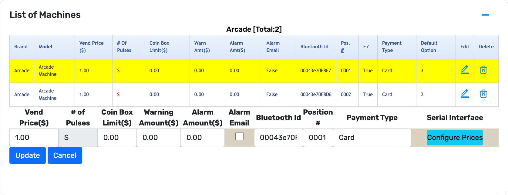 When you access this page, you will first see a list of all machines for the selected location. To make changes, click Edit on the desired machine. Do not click Delete, as this will permanently remove all information for that machine from your portal. When a machine is selected for editing, it will be highlighted in yellow, and the editable fields will appear at the bottom of the page. From here, you can update the Price, Position, and specify whether the machine accepts Coin and/or Cash. Note that the number of Pulses must match the dollar value in quarters (for example, $5.00 equals 20 pulses).