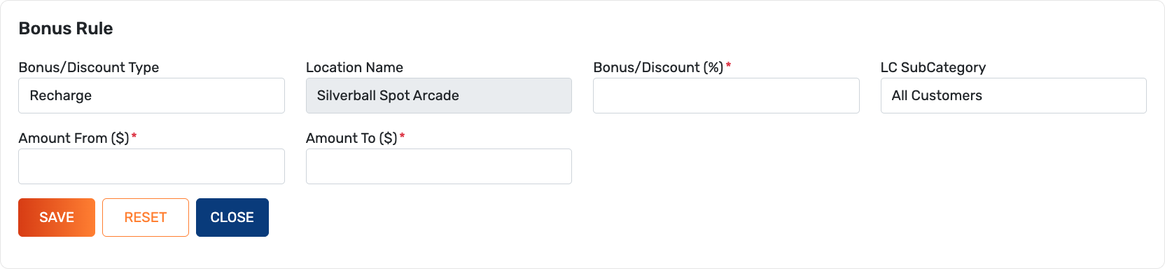 On the Manage Bonus page, you can add or edit existing recharge bonuses and machine discounts. Scroll to the bottom of the page for the location where you want the promotion applied, then click the corresponding button to access the promotion setup page. From there, you can specify the bonus percentage that customers will receive for a reload amount within the defined ‘Amount From’ and ‘Amount To’ range. Once you click Save, the promotion will appear in the list below, confirming that it has been successfully added.